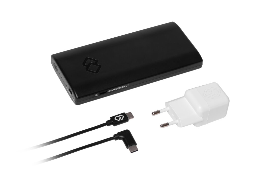 Lithium-Polymer-Powerbank für die Notstromversorgung der iLens-Brille mit Ladezustandsanzeige, Kapazität 10 Ah.
