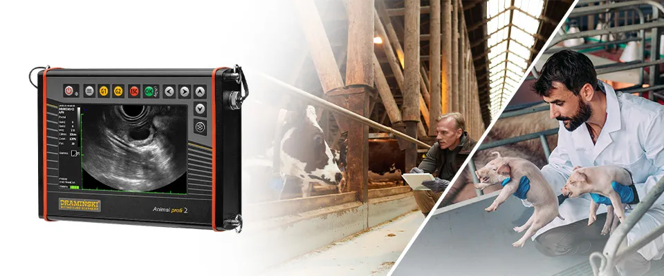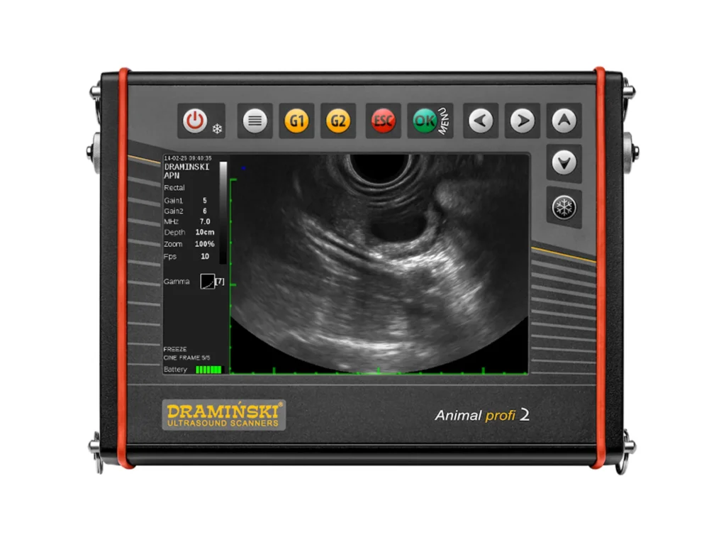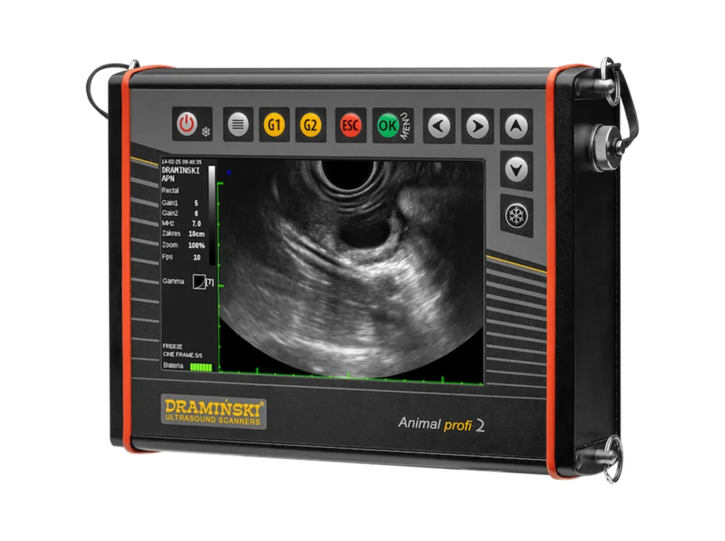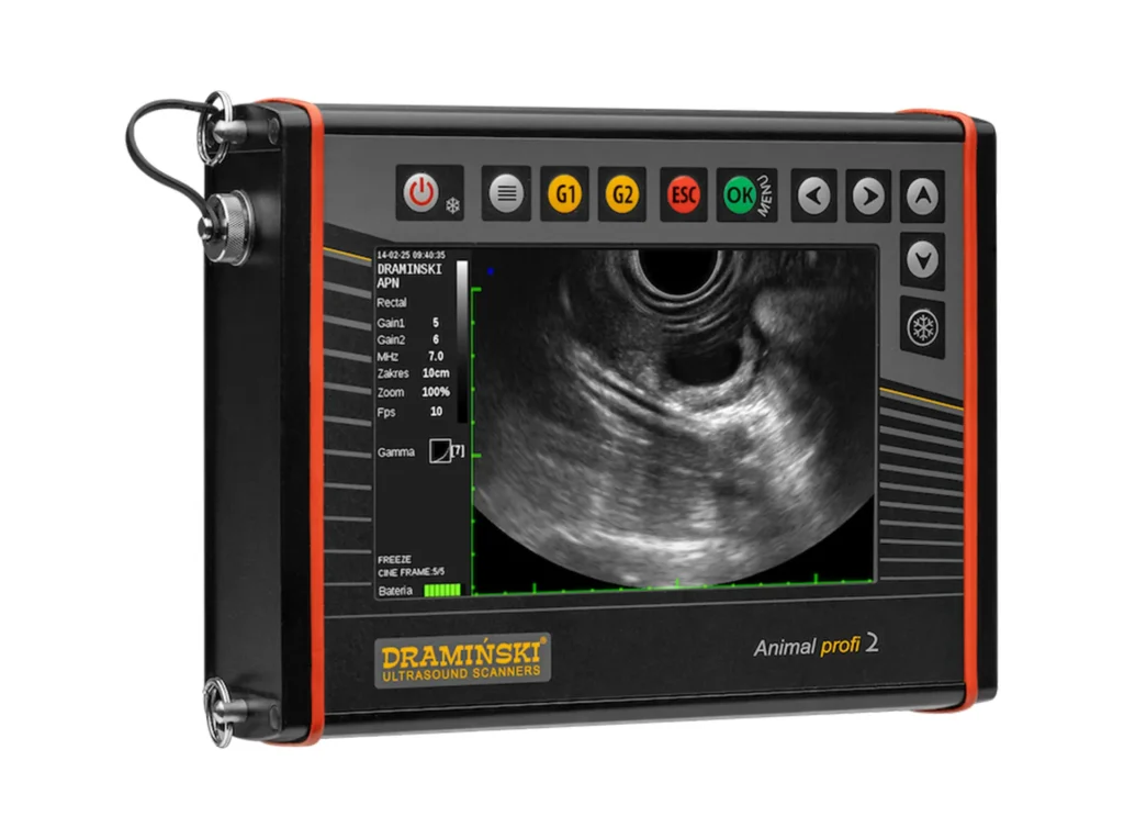 Der DRAMIŃSKI Animal profi 2 wurde für die bildgebende Diagnostik von Nutztieren entwickelt, hauptsächlich im Bereich der Fortpflanzung. Mit diesem Ultraschallgerät können Sie je nach verwendeter Sonde die Bauchorgane untersuchen, urologische und gynäkologische Untersuchungen durchführen, einschließlich der rektalen Untersuchung.